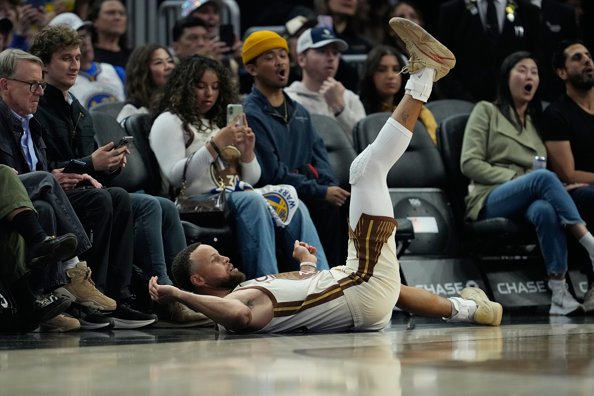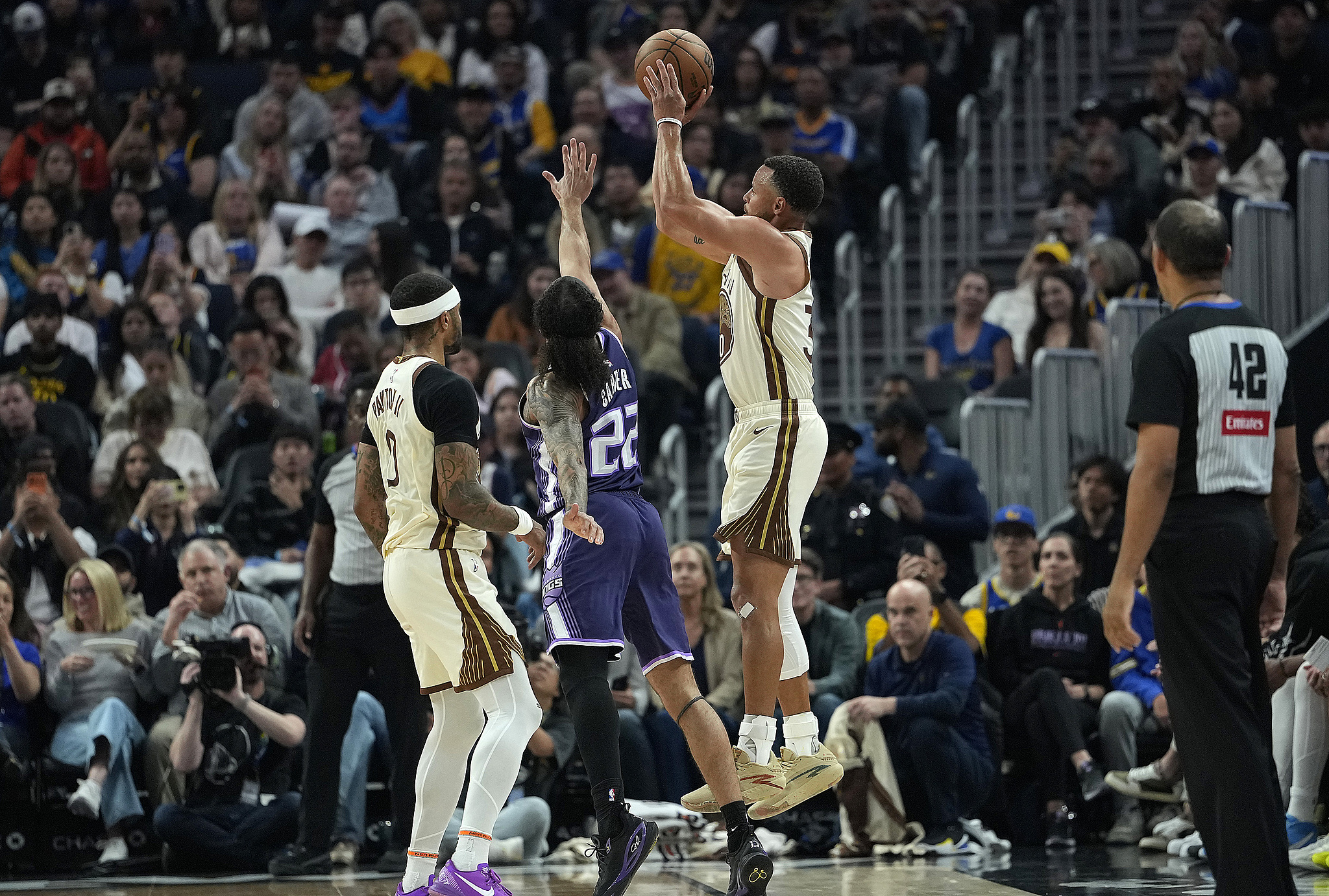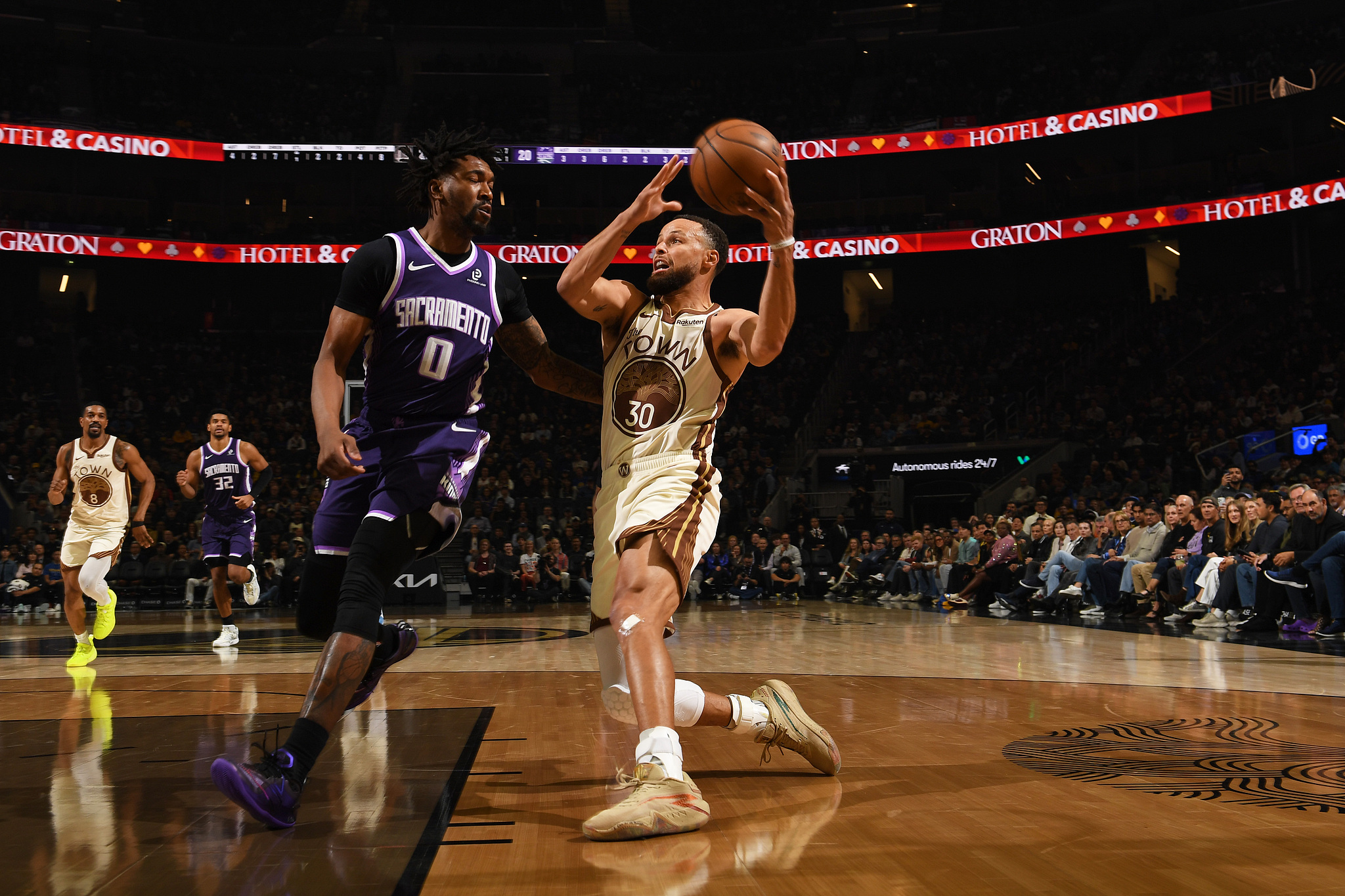 第二节,勇士全队火力全开,单节41-27净胜国王14分,这一节库里打疯了,连续轰进两记不讲理3+1,坐在地板上激情庆祝,全场为他高呼MVP;之后库里突破打板颠进,单节4投3中独砍11分;半场打完勇士66-53领先国王13分,上半场库里7投4中拿到14分3篮板,79秒连轰两个3+1秀翻全场。