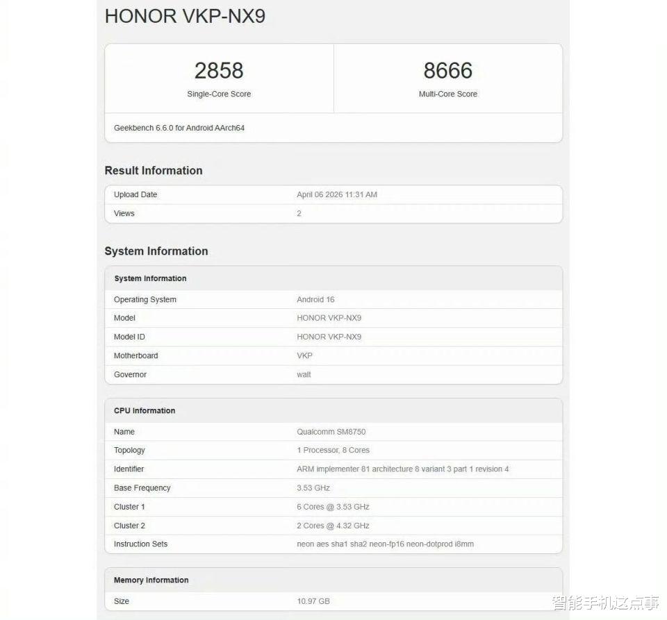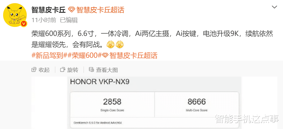 其次,此前的市场中还传出了配置规格相关的信息,而且荣耀600 Pro的跑分数据已经出来了,单核2858分、多核8666分,搭载的是骁龙8 Elite处理器,配12GB内存,出厂预装Android 16。