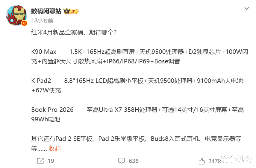 此次红米的重磅产品有红米k90 max手机、红米k pad 2平板电脑,两款机型都采用天玑9500处理器,并拥有165Hz高刷,走极致电竞路线,很符合性价比党和游戏党的需求。