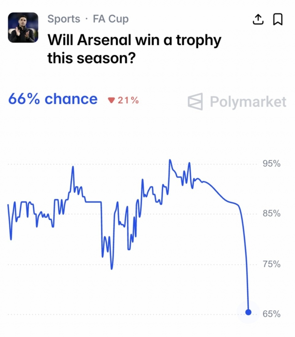 本轮过后,权威数据机构Polymarket Sports更新了阿森纳与曼城的英超夺冠概率。