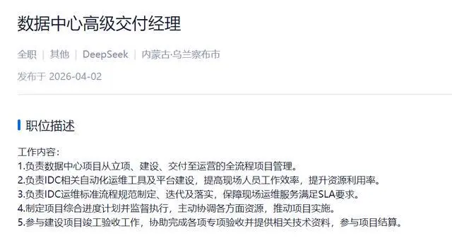 4月15日,AI大模型公司DeepSeek发布全新招聘岗位,此次招聘岗位为数据中心高级运维工程师、数据中心高级交付经理,月薪最高达30000元。