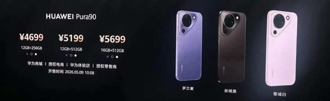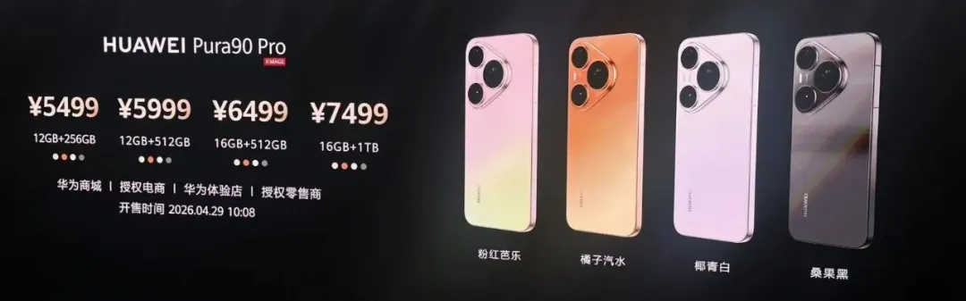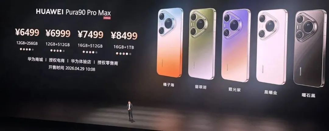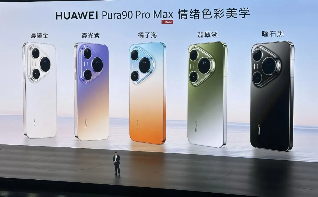 华为Pura90Pro Max就带来橘子海、翡翠湖、霞光紫、晨曦金、曜石黑五款配色。