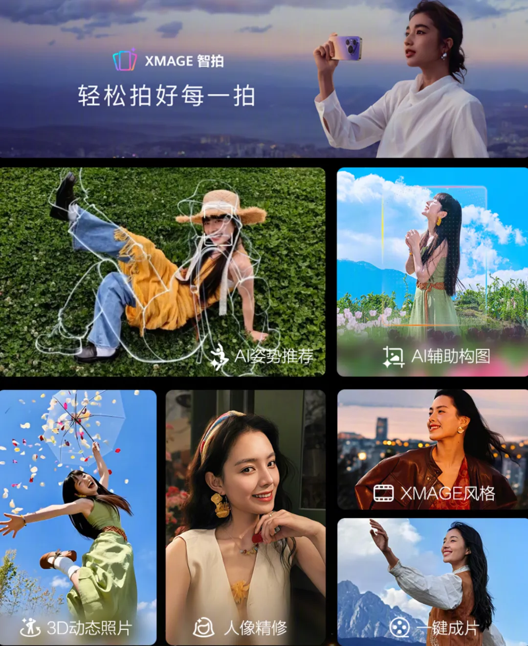 不光是硬件这块很强,在玩法这块华为也带来了“XMAGE智拍”:AI姿势推荐、AI辅助构图、XMAGE风格、3D动态照片、人像精修、一键成片……