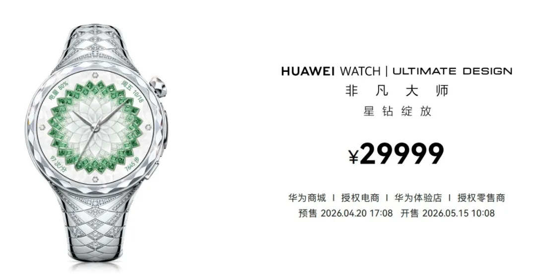 华为WATCHULTIMATE DESIGN 非凡大师 星钻绽放款,甄选99颗天然钻石售价29999元。