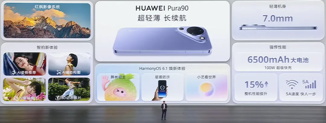 Pura90这次在外观设计上最大的变化是相机deco变了,有罗兰紫、丝绒黑、雪域白三种配色。整机电池为6500mAh 7.0mm的厚度,性能提升15%。影像配置上:后置1250万像素超广角摄像头、5000万像素超聚光主摄、5000万像素超聚光潜望长焦,前置5000万像素超聚光人像摄像头,同时前后都带红枫原色摄像头。