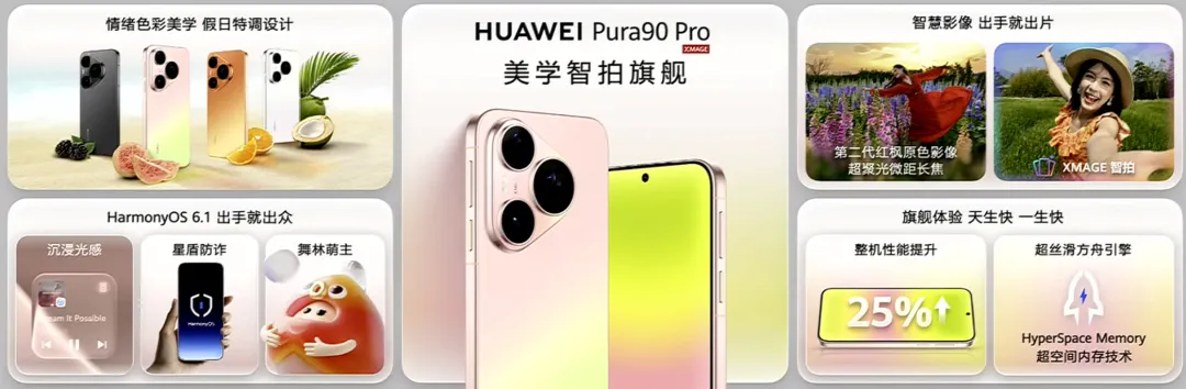其中Pura90 Pro搭载1250万像素的超广角摄像头,5000万像素超聚光主摄,5000万像素超聚光微距长焦,第二代红枫原色摄像头。