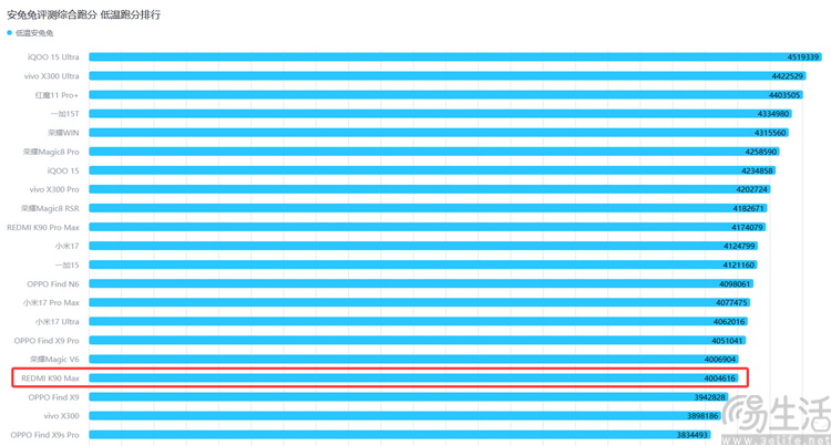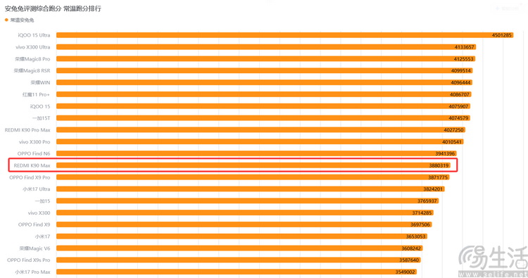 将其代入我们三易生活的跑分榜单就会发现,REDMI K90 Max的常温成绩高于绝大多数同平台机型。这似乎确实表明,主动散热设计令它可以更好地发挥出天玑9500的性能潜力。