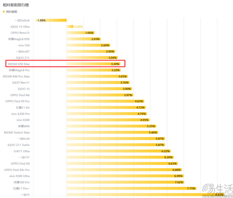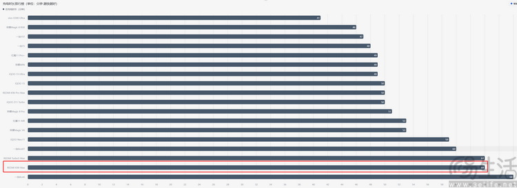 在我们的跑分相对差距榜单里,这台REDMI K90 Max取得了第8名的位置,位居前列。这意味着主动散热设计确实帮助它在常温、无辅助散热的前提下,发挥出了更接近最大“潜力”的性能。说得更直白一点,也就是用户日常使用的性能上限,会更接近理论上的极限,普通用户为硬件规格所掏的钱,更多地能被实际“用出来”。