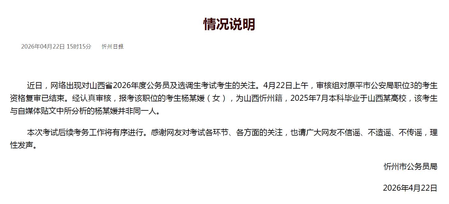 近日,网络出现对山西省2026年度公务员及选调生考试考生的关注。4月22日上午,审核组对原平市公安局职位3的考生资格复审已结束。经认真审核,报考该职位的考生杨某媛(女),为山西忻州籍,2025年7月本科毕业于山西某高校,该考生与自媒体贴文中所分析的杨某媛并非同一人。