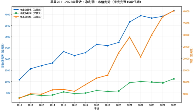 到2025年财年,苹果的营收已经高达4161.61亿美元,是2011年的4倍左右,而利润则是达到了1120亿美元,是2011年的4倍。