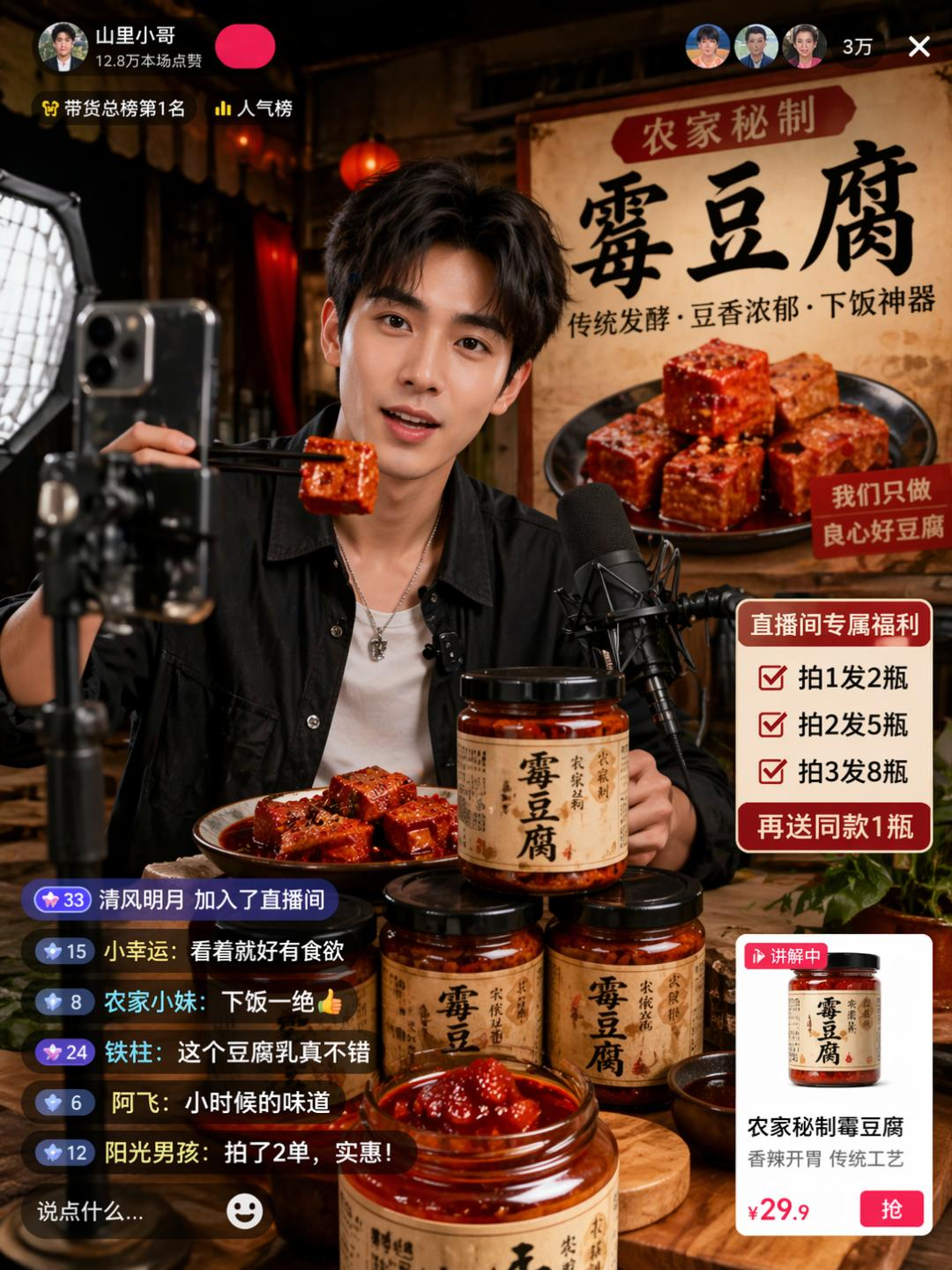 产品UI截图和原型演示。需要做一个App界面的效果图给领导看?以前得打开Figma认真画。现在一句话描述就能生成带中文按钮、中文标签、中文导航栏的高保真界面截图。那张直播截图的UI元素准确到什么程度?关注按钮、弹幕区、购物车、价格标签,每一个组件的位置和样式都符合真实抖音的界面规范。