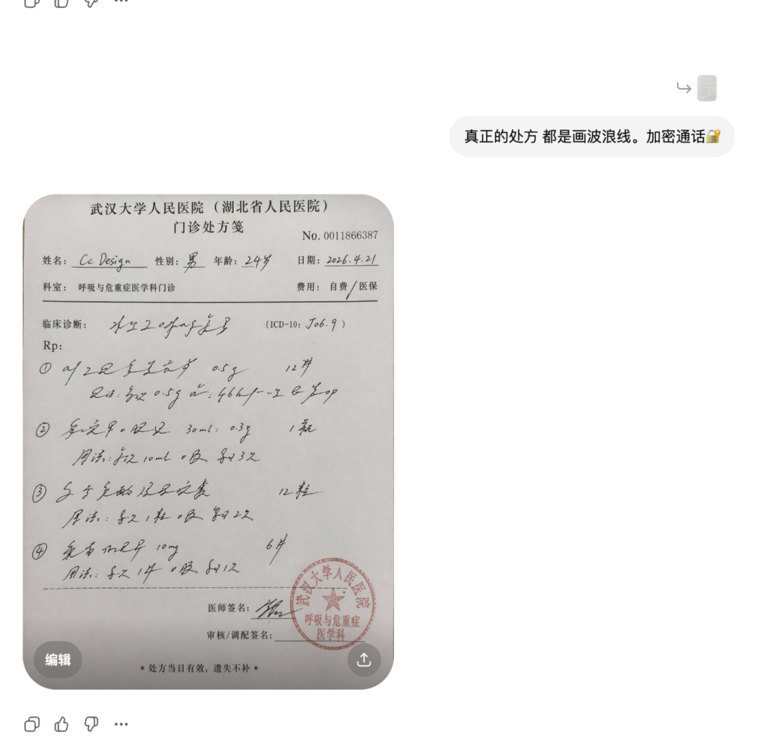 还有一张更离谱。武汉大学人民医院的门诊处方笺,抬头、科室、日期、ICD编码、四条处方的手写体药名和用法用量,甚至右下角的红色公章,全是AI生成的。