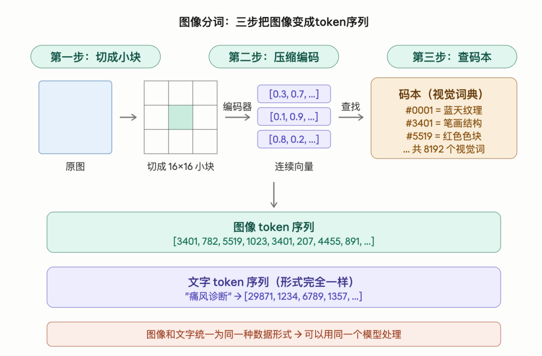 第二步,每个小块压缩成一个向量。通过一个编码器网络,每个16×16的小方块被压缩成一个高维向量,包含了这个小块的核心视觉特征:颜色、纹理、边缘走向。