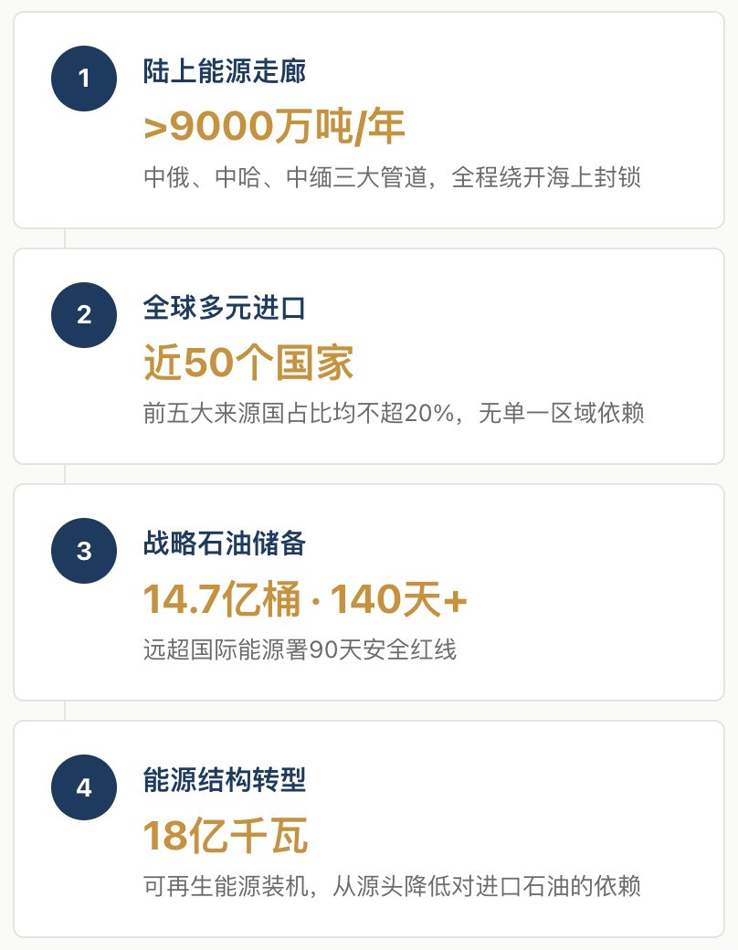 ① 中国的能源防御层已经成型——依赖度降至约33%,陆上管道年输油超9000万吨,战略储备覆盖140天以上,短期冲击可控。