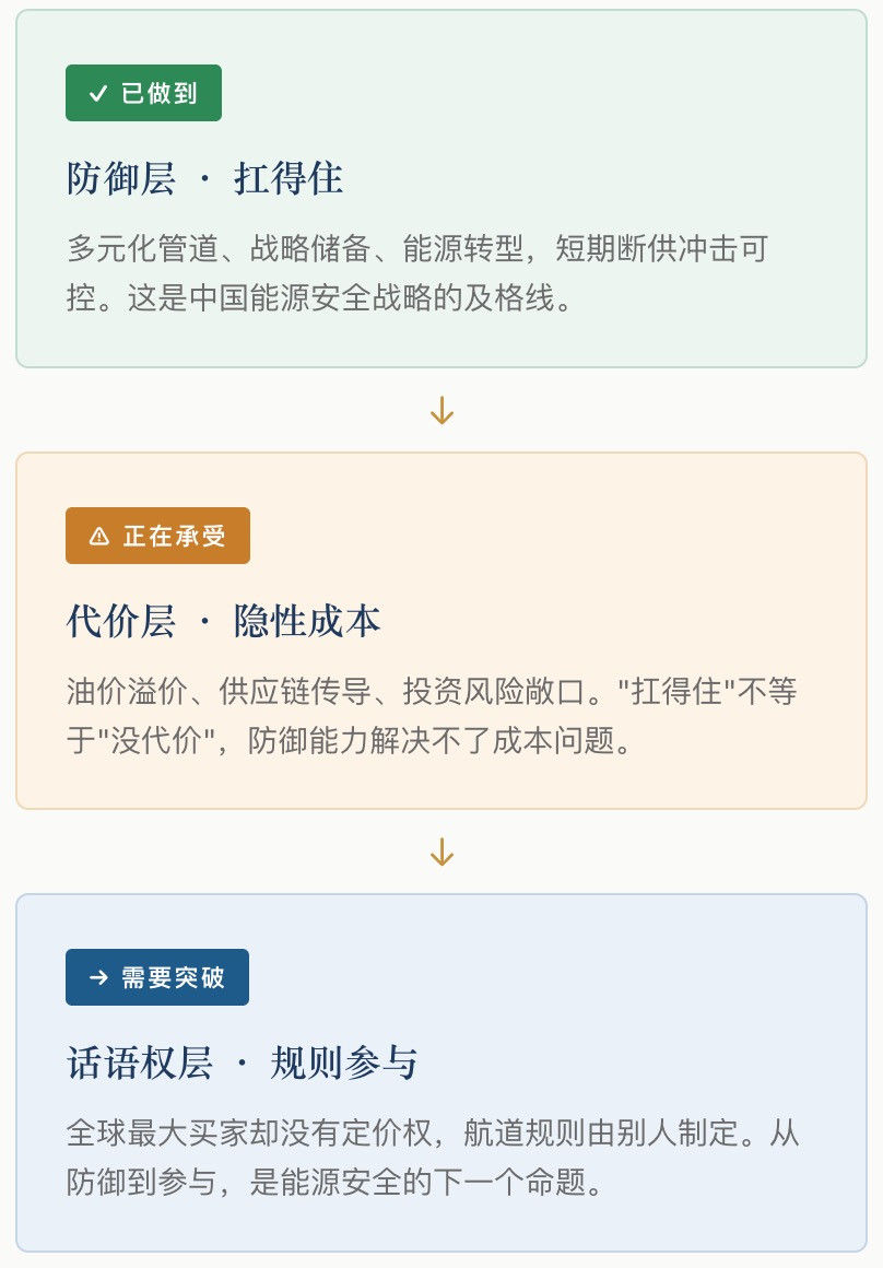 霍尔木兹海峡博弈像一面镜子,照出了一个事实:中国的能源安全战略从"活下去"走到了"活得稳",但还没有走到"活得好"。防御层已经足够坚固,但一个真正有韧性的能源安全体系,不能只靠防御——它需要让自己变成既有盾也有牌的那一方。盾让你不被击倒,牌让你在博弈中有对等的话语权。这条路的终点,不是让自己与全球能源体系更隔离,而是让自己在其中有更深、更不可替代的参与。