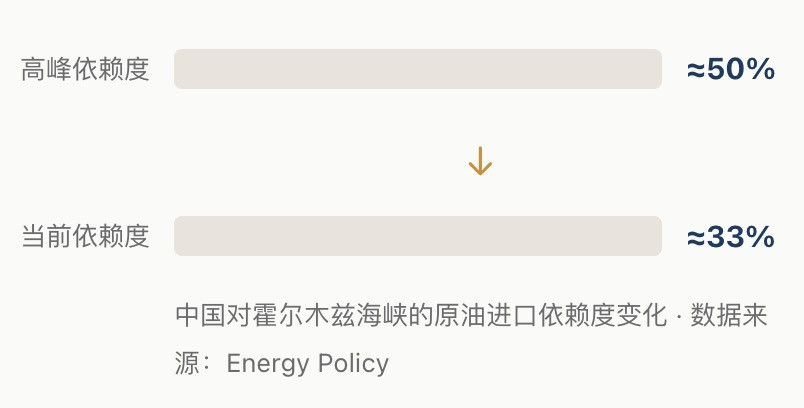 中国对霍尔木兹海峡的原油进口依赖度已经降到了约33%。从高峰期的接近一半降到三分之一,背后是三件事同时起作用。