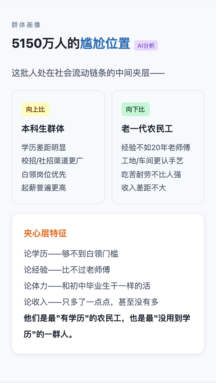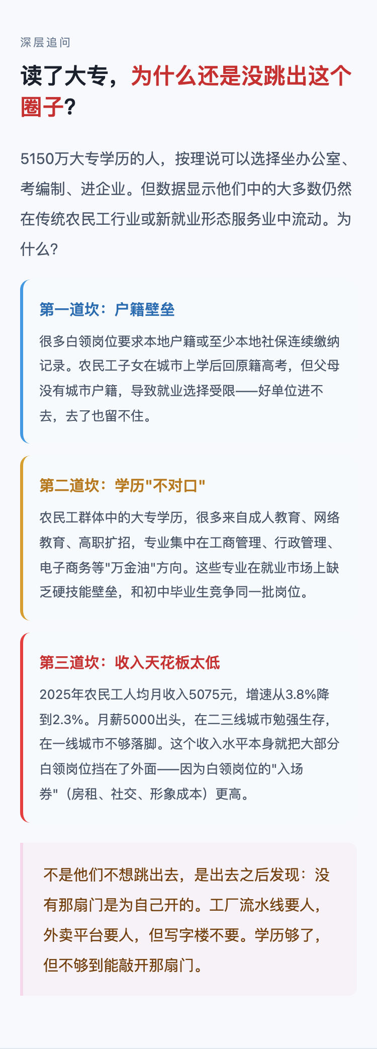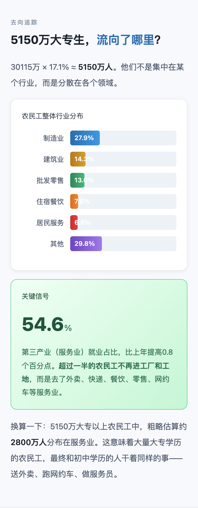 3亿农民工大变样:5150万大专生去哪了?他们不干工地了 作者: • 更新时间:2026-04-30 22:31 • 本文内容由互联网用户自发贡献,该文观点仅代表作者本人。如发现本站有涉嫌抄袭侵权/违法违规的内容,请发送邮件至 203304862@qq.com 本文链接:https://jinnalai.com/jiaodian/826061.html