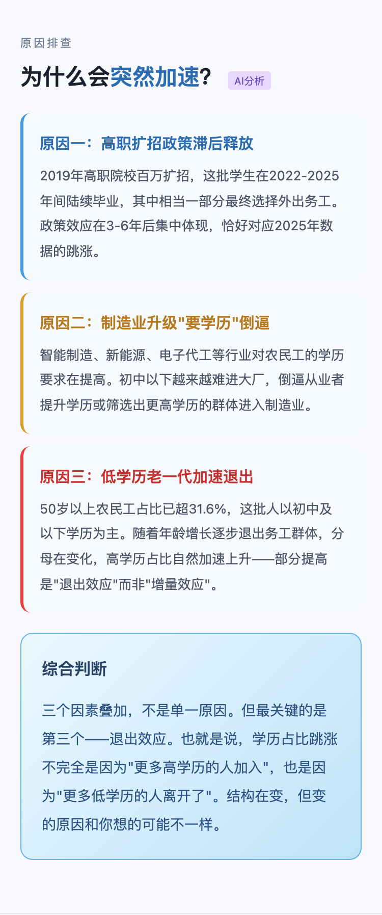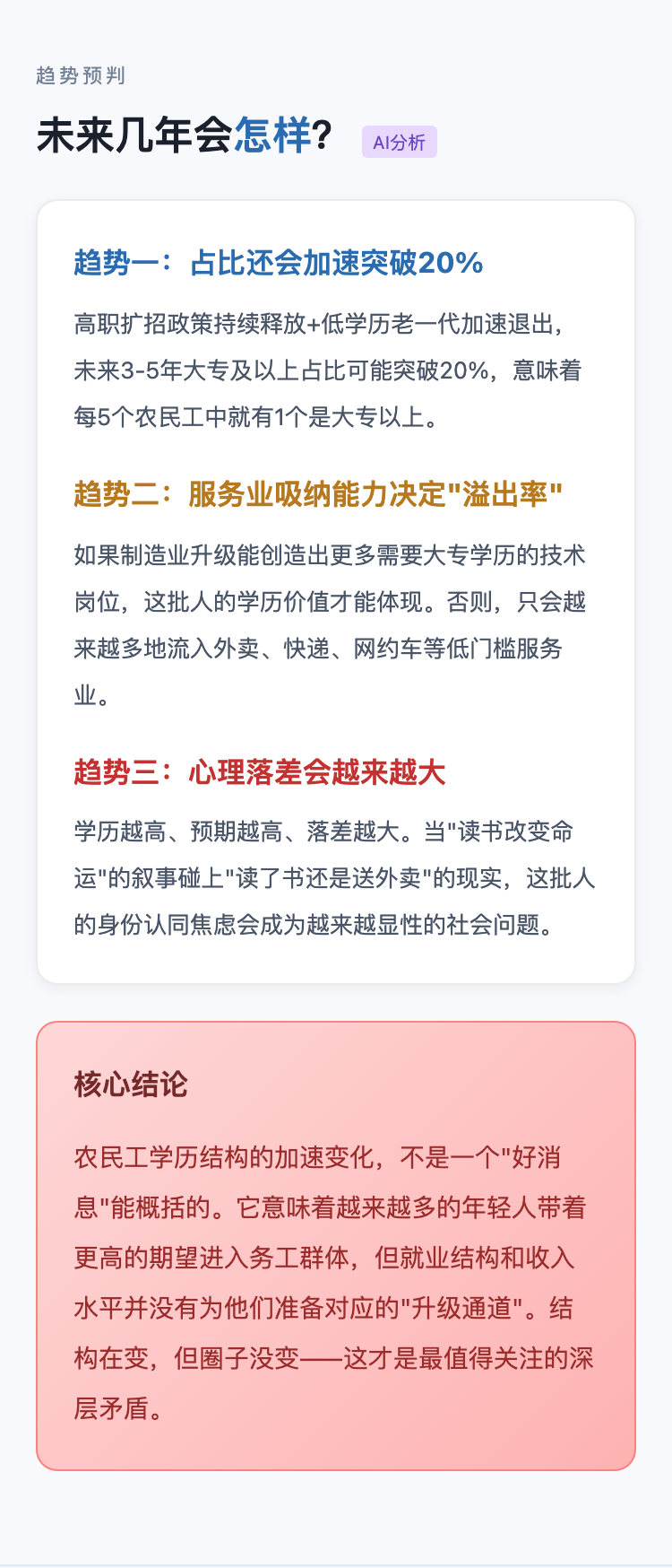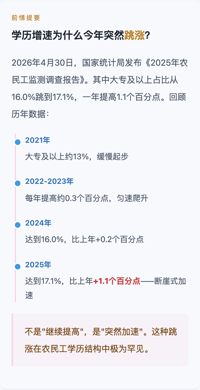 3亿农民工大变样:5150万大专生去哪了?他们不干工地了 作者: • 更新时间:2026-04-30 22:31 • 本文内容由互联网用户自发贡献,该文观点仅代表作者本人。如发现本站有涉嫌抄袭侵权/违法违规的内容,请发送邮件至 203304862@qq.com 本文链接:https://jinnalai.com/jiaodian/826061.html