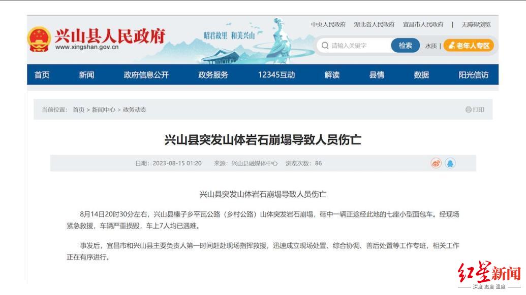 据新华社报道,湖北省宜昌市兴山县人民政府发布消息,8月14日20时30分左右,兴山县榛子乡平瓦公路(乡村公路)一处山体突发岩石崩塌,砸中一辆途经此地的7座小型面包车,导致车辆严重损毁,车上7人均遇难。事发后,宜昌市和兴山县迅速组织救援。目前相关处置工作正在进行。