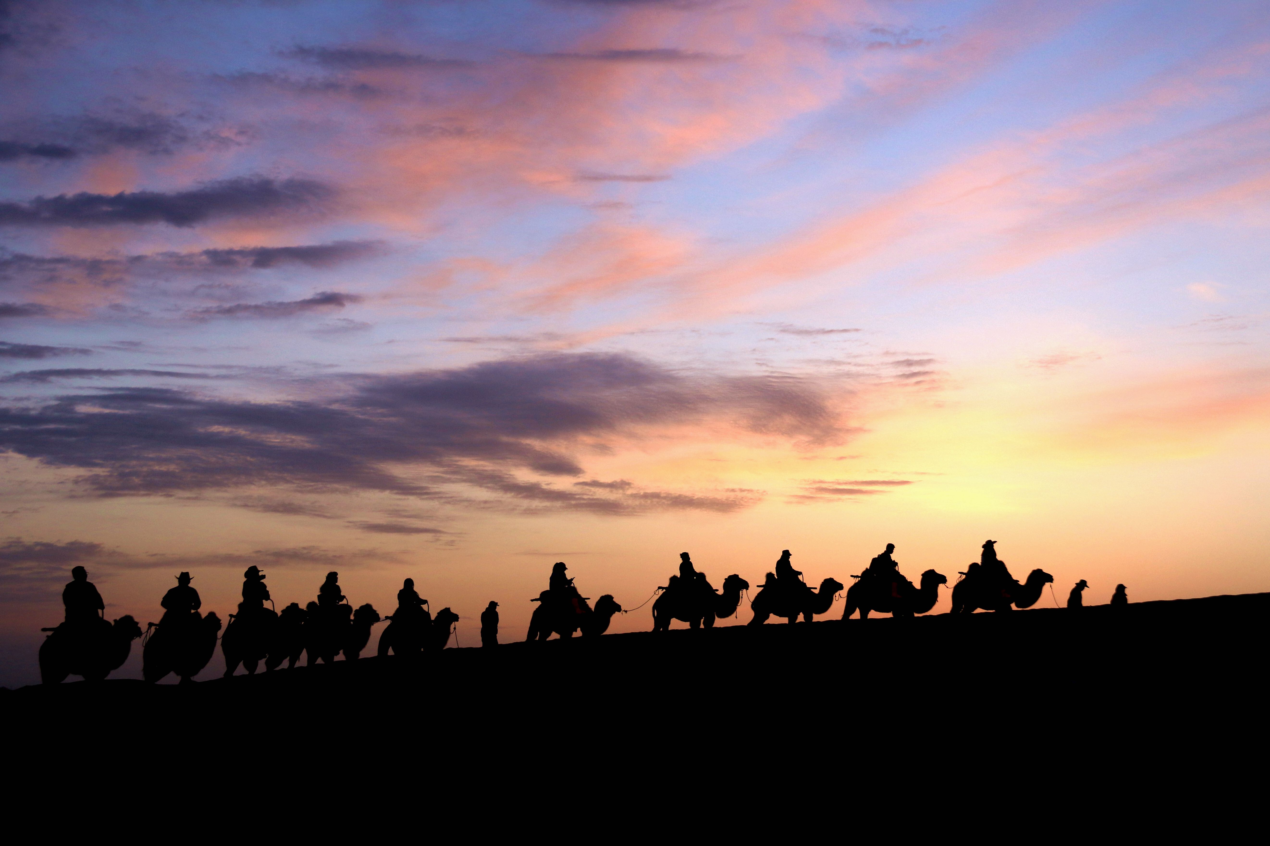 10月1日,在甘肃省敦煌市鸣沙山月牙泉景区,游客在晨光中骑骆驼游览。