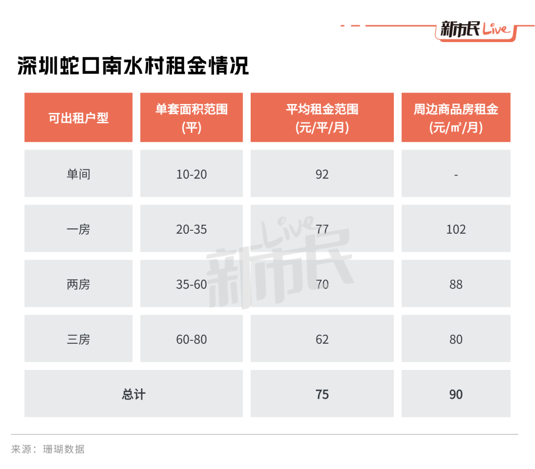根据珊瑚数据的统计数据,南水村里民房的平均租金约为75元/平,低于所属蛇口街道的平均租金79元/平,更低于周边商品房的平均租金90元/平。