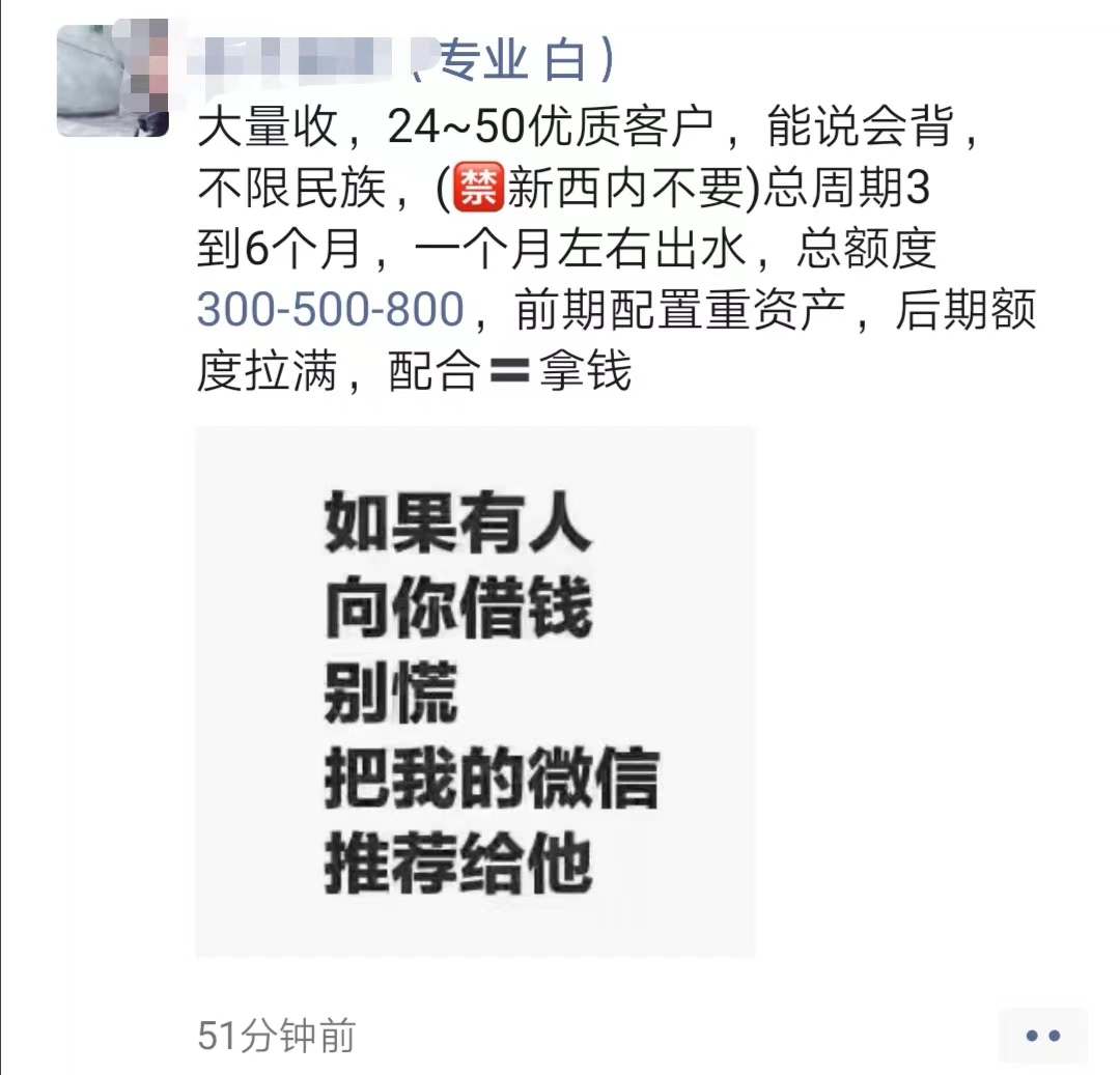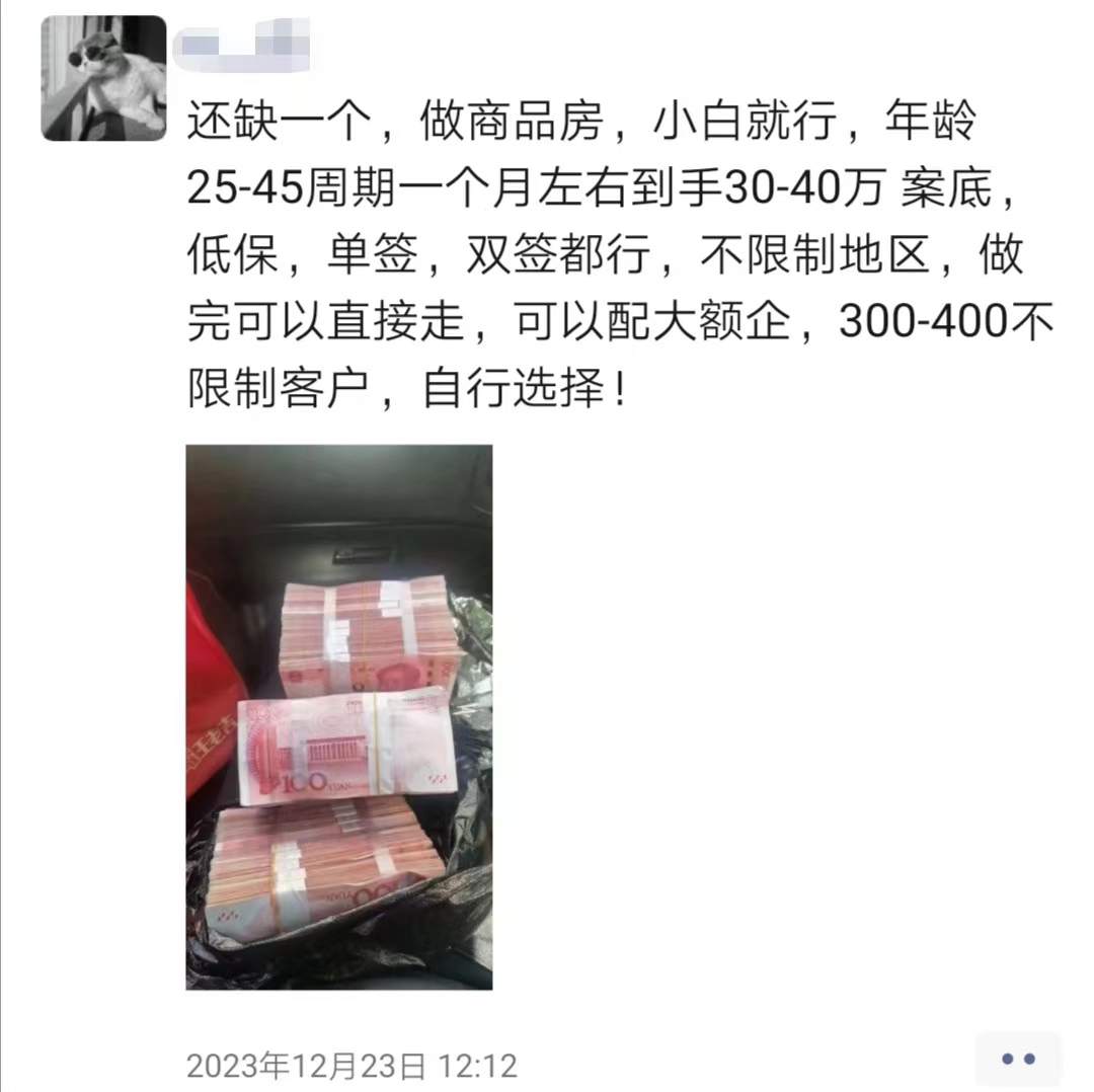 “直背400(万),纯白户、花户都行,年龄25到45岁”“做商品房,一个月到手40万,后期可以配大额企业,300(万)到400(万)”。2023年12月底至今年1月初,蓝旭东每隔几天,就放出一条类似的消息:“年前最后一批,赶上能过个肥年。”