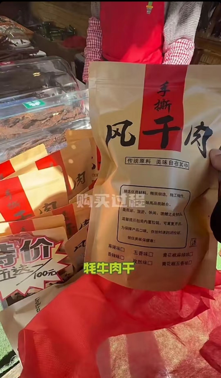 相关视频显示,在大理古城五华楼旁一家店铺,博主询问摆放的是什么肉品时,商户回复称,是风干的牦牛肉干,128元一斤。博主翻看装肉品的袋子发现,上面标注为“手撕风干肉”,随即质问商家。商家解释称“大家买都是这个袋子装”,并坚称所售肉品是牦牛肉干。