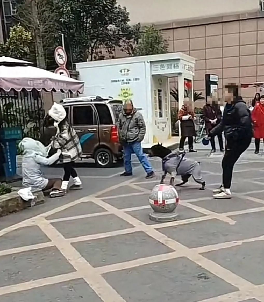 网传视频显示,在四川成都人居都市阳光小区门口,一名男子牵着一只狗,狗的女主人与另一名女子正在争执,“老子的狗金贵得很,你凭什么说它”。狗的男主人要求报警,并表示是女子先动的手。而另一个视频中,男子牵着狗,狗没有佩戴嘴套,在朝着前方打架的女子吼叫。前方,上述视频中的女子与狗的女主人扭打在一起,女子被压着头按在地上,拿着一根棍子打向对方。