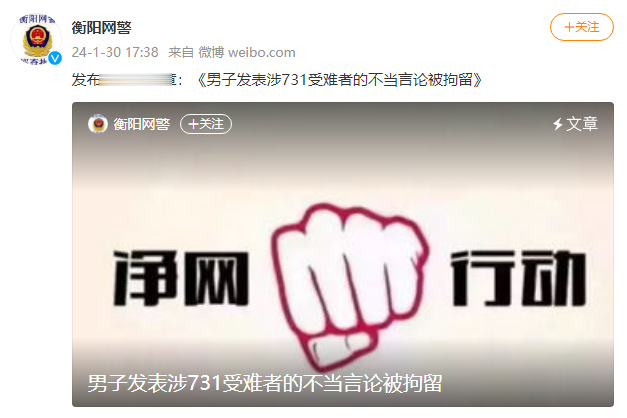 经查,该网民为衡阳县籍人员于某,现居住在湖南省衡阳市石鼓区。为吸引眼球,在直播间内发布涉731受难者的不当言论。经公安机关批评教育,于某认识到自己的错误行为,主动写道歉信认错悔过。目前,于某已被衡阳市公安局石鼓分局依法处以行政拘留十日的处罚。