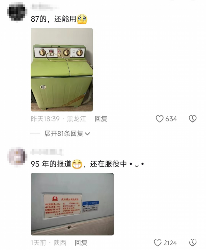 这一温暖动人的故事就这样出圈了,“威力”也在全网各平台登上热搜。网友纷纷在社交平台晒出自家还在“服役”的威力洗衣机,1998年的,1995年的,1993年的,最早的甚至还有1987年生产的,有网友称用了30年仍一切正常,让人感叹中山制造的坚韧和耐久。