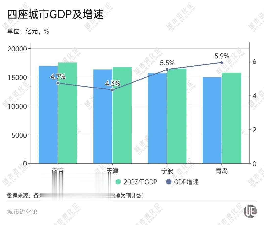 从增速来看,2023年,南京、天津、宁波和青岛GDP增速分别为4.7%、4.3%、5.5%、5.9%,南京、天津跑输全国大盘,宁波和青岛则高于全国平均水平。而从经济规模来看,目前宁波领先青岛约700亿元,与天津、南京的差距则分别为300亿元、1000亿元左右。