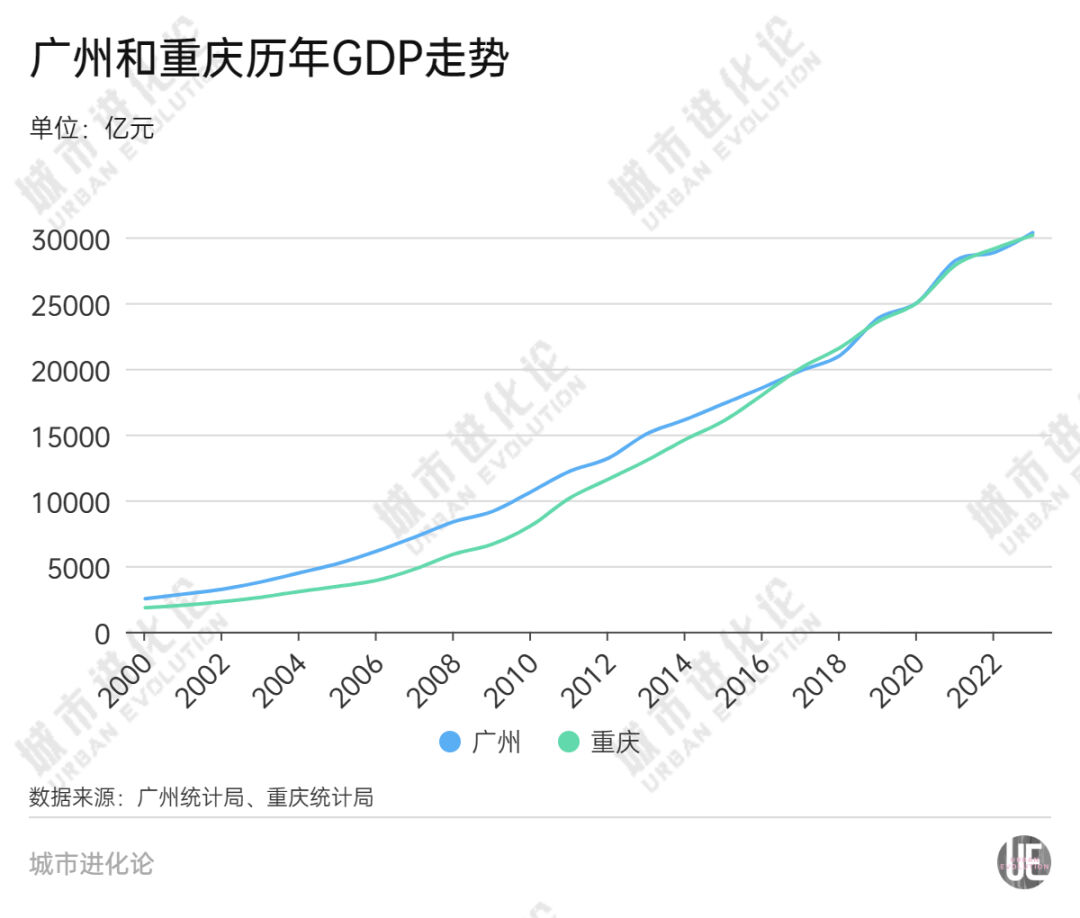 2023年,广州、重庆GDP同时突破3万亿元,两城持续多时的“第四城”之争也再次迎来反转——