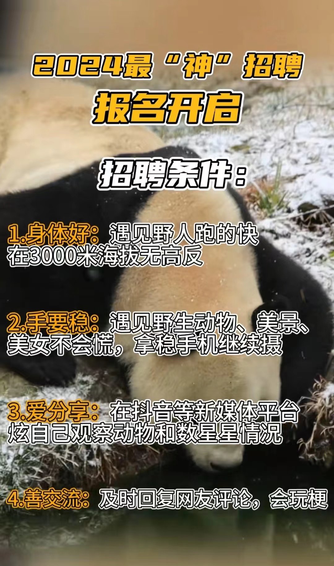 4月3日,神农架景区在某视频平台发布自然观察员招聘信息,主要职责为观察野生动物,兼职数星星,工作周期为三个月。4月10日,景区公布该职位招聘条件为“身体好,遇见野人跑得快”,在3000米海拔无高原反应,手要稳、爱分享、善交流等。由于神农架素有“野人出没”的传说,该招聘信息一经发布便引发了网友的调侃。