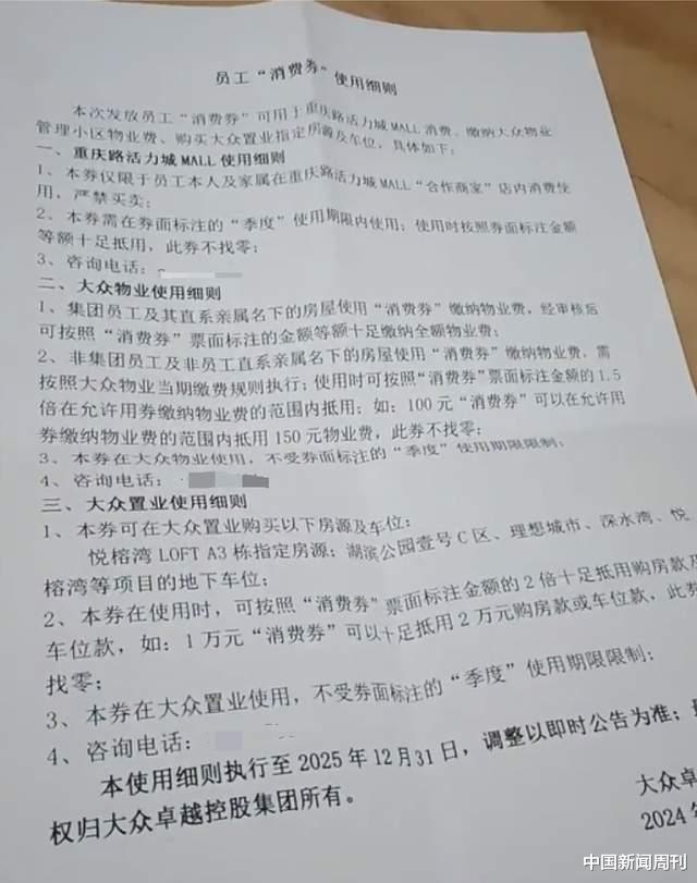 近日,吉林长春一公司用消费券代替工资发放,引发关注。消费券面值10-100元不等,限定在公司相关商场消费、缴纳物业费、购买指定房源及车位等。网友称,“这就是摩天活力城开的工资,不是现金人民币而是消费券。”