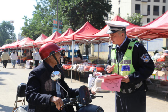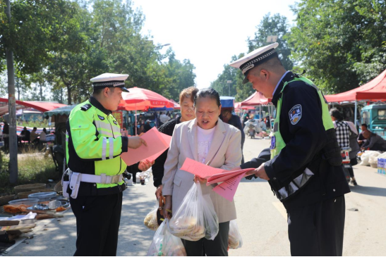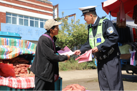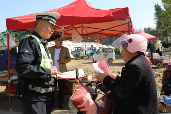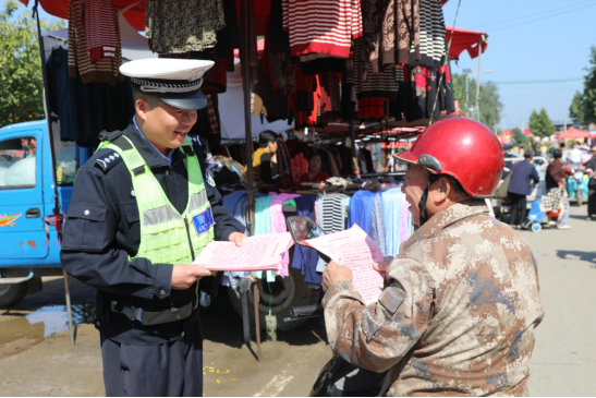 活动现场,集市内人头攒动,民警辅警针对秋收时节常见的交通安全隐患,如农用车辆违法载人、面包车超员、驾乘摩托车不戴安全头盔、酒后驾驶等违法行为,结合典型事故案例,用通俗易懂的“家常话”向赶集的农民朋友和摊主们进行面对面讲解。