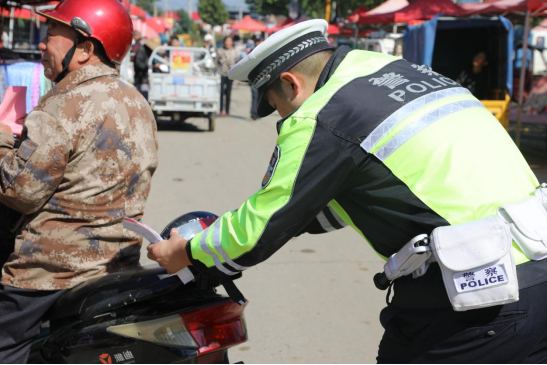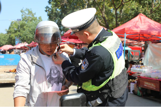 “大叔,您看这个案例,就是因为三轮车违法载人,一个急转弯就造成了悲剧,咱可千万不能图一时方便,用拉货的车拉人啊!”民警辅警一边发放宣传册,一边耐心地提醒一位正在选购农具的村民。宣传过程中,民警辅警还重点强调了“一盔一带”的重要性,现场演示如何正确佩戴安全头盔,并为电动车张贴反光贴,呼吁大家要将“安全”二字牢记心中,自觉摒弃交通陋习,做到安全、秋收两不误。