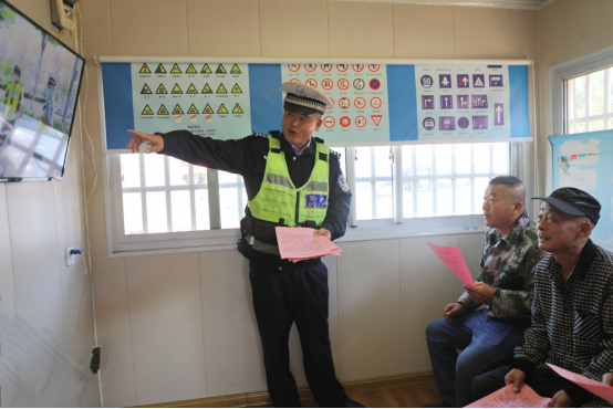 除了现场的集中宣讲,还特别邀请了多位来赶集的老年人,走进位于集市旁的交通安全劝导站宣教室。在宣教室内,民警辅警为老人们播放了精心准备的农村交通事故警示案例视频。视频中,因三轮车违法载人、横穿马路不注意观察、无证驾驶等引发的真实事故案例,以最直观的方式呈现了交通违法带来的严重后果,给在场的老人们带来了极大的震撼。民警辅警在一旁结合视频内容,耐心讲解老年人出行注意事项,提醒他们“被看见才安全”,早晚出行要穿着鲜亮衣物,遵守交通规则。
