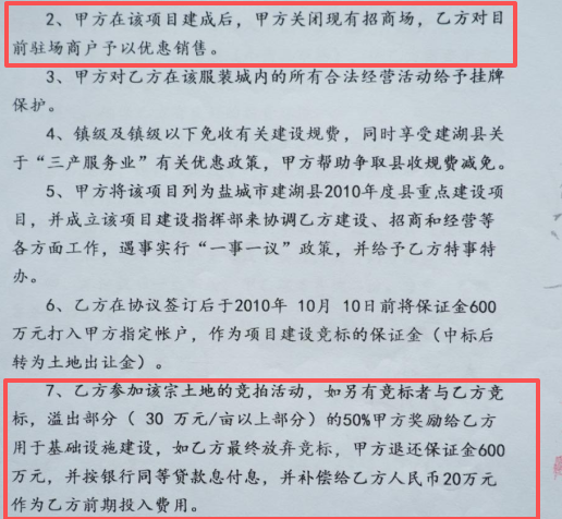 “2010年9月,上冈镇政府通过建湖县委政法委员会的协助,引进了扬州建设房地产开发经营有限公司(以下简称扬州建设房地产公司)建设新招商场易家乐生活广场项目,前期涉及80亩土地,按照当时县城的商业用地30万元/亩价格签订了协议,为此还缴纳了600万元保证金。该项目被列为建湖县当年重点建设项目,政府为此还成立了项目建设指挥部,遇事实行一事一议政策。”杨万红向潮新闻记者展示了扬州建设房地产公司与上冈镇人民政府签署的协议书。