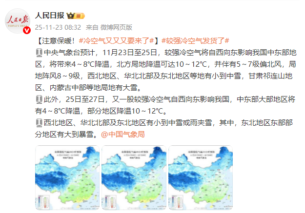 [注意保暖!冷空气又又又要来了]中央气象台预计,11月23日至25日,较强冷空气将自西向东影响我国中东部地区,将带来4~8℃降温,北方局地降温可达10~12℃,并伴有5~7级偏北风,局地阵风8~9级,西北地区、华北北部及东北地区等地有小到中雪,甘肃祁连山地区、内蒙古中部等地局地有大雪。