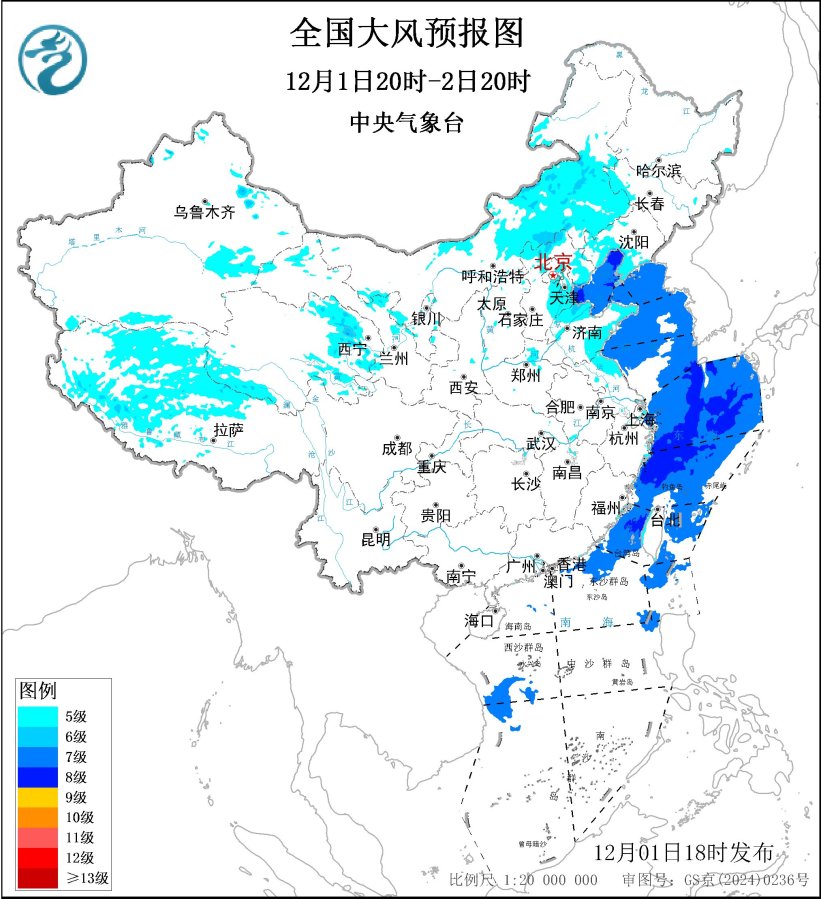 12月2日20时至3日20时,内蒙古中东部、辽东半岛、山东半岛、青海南部、西藏中北部等地部分地区有5~6级、阵风7~9级的大风;渤海东南部海域、渤海海峡、黄海、东海大部海域、台湾海峡、台湾以东洋面、南海北部和中部海域、巴士海峡将有7~8级、阵风9~10级的大风。