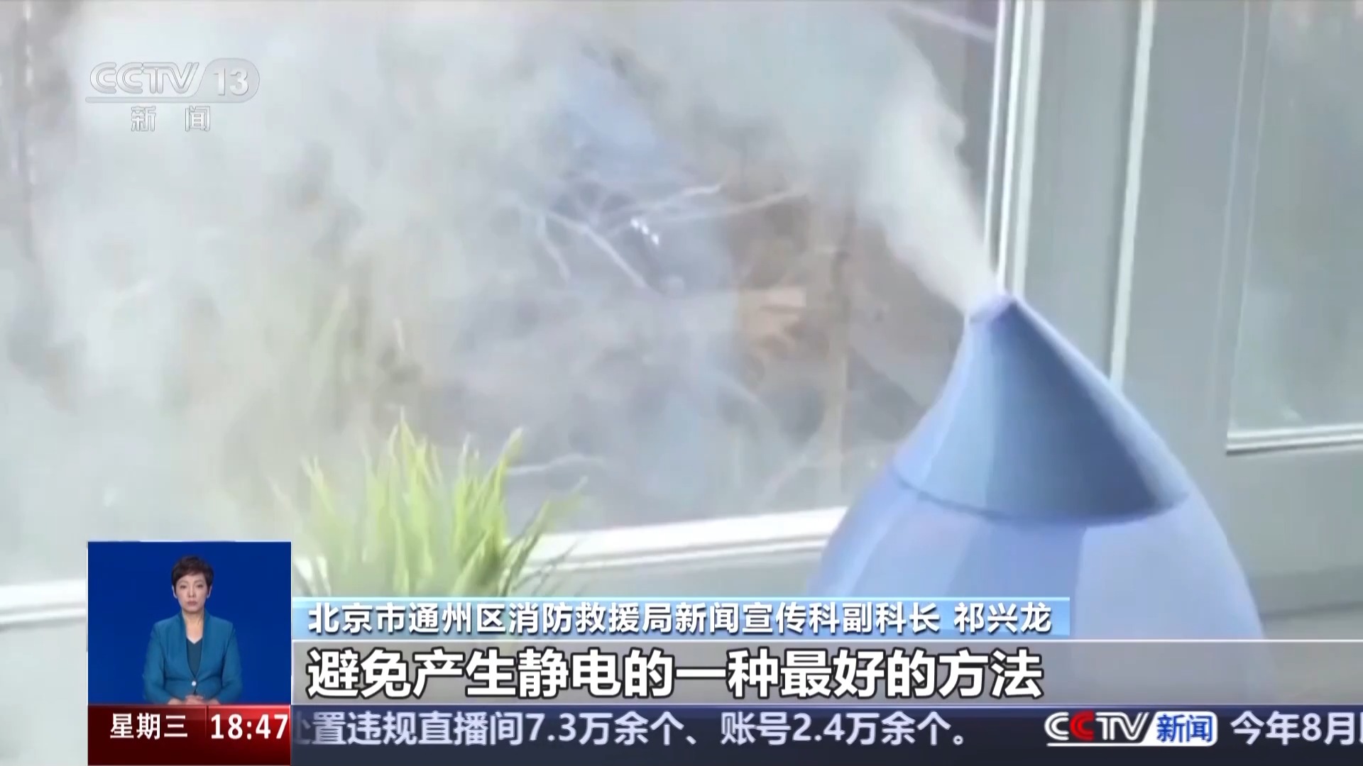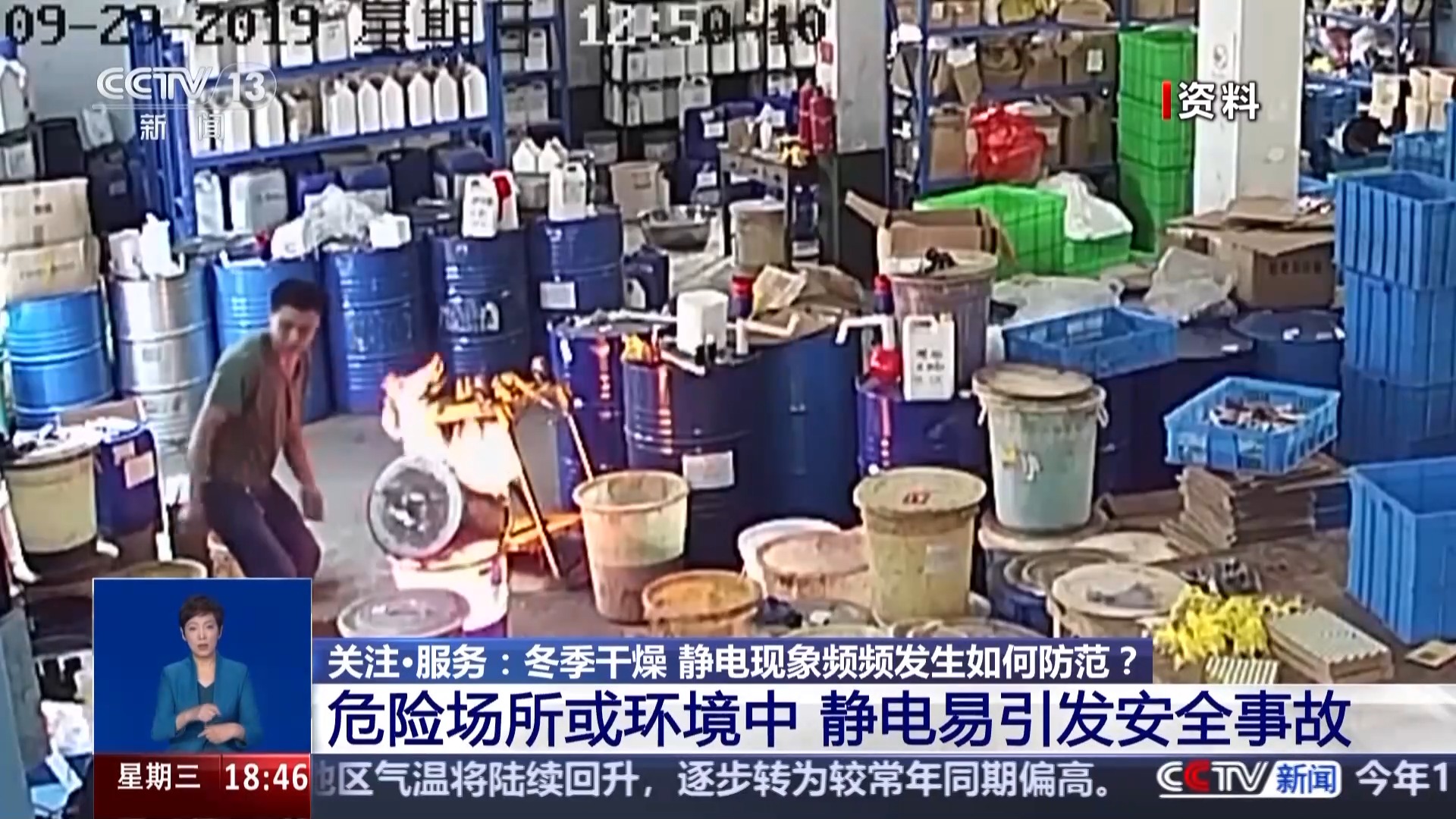 北京市通州区消防救援局新闻宣传科副科长祁兴龙:第一就是操作人员的着装、他的劳保设施需要具有防静电功能,甚至于部分场所需要佩戴防静电手环、防静电脚环等这些相关的设施来预防静电的产生和及时地将静电导出。那么另外一个方式,这些场所内都会有一些静电导出的装置,在我们操作相关设施或者进入相关场所时,需要触碰这些设施,将身体的体内静电导出,避免发生静电,发生电火花造成危险。
