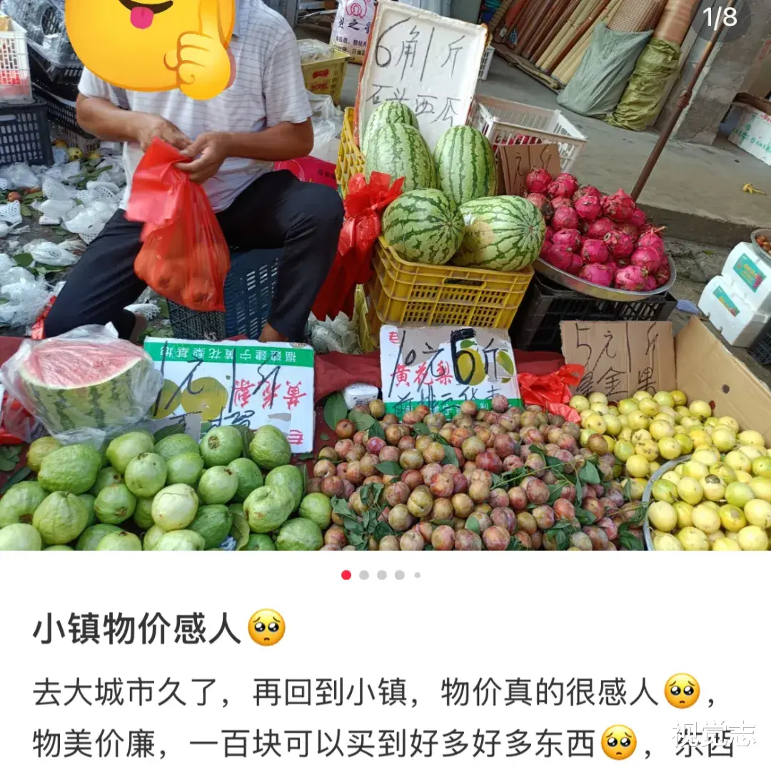 水果更是敞开肚子随便吃。在一线城市的超市里,西瓜得六七块钱/斤,而在小县城,直接降至6毛/斤,价格相差近10倍。
