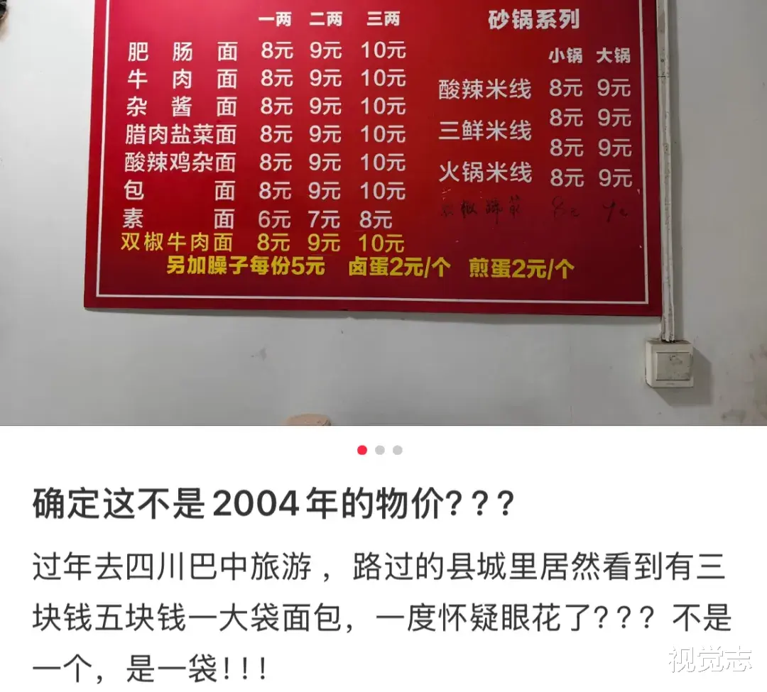 对于长年生活在大城市的人来说,小县城的物价就像“重生之回到2004年”,10元3两的牛肉面、5块钱一大袋的面包片,简直让人不敢相信。
