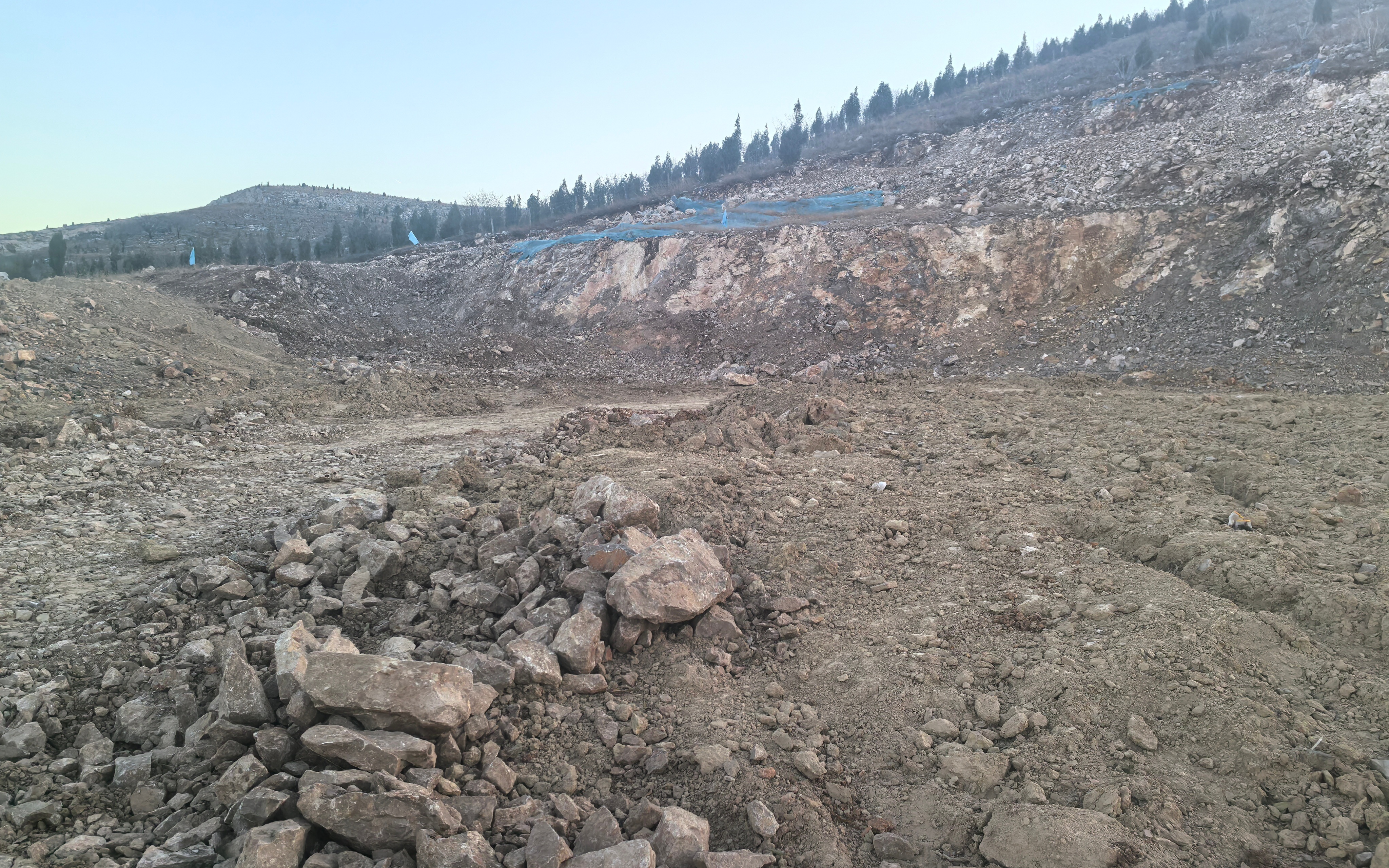 整个项目唯一的建筑是两层简易板房构成的“项目部”,门前砂石路上安装有一台地磅。项目区由东向西呈带状分布,东部为一期工程,西部为二期工程。目前一期项目区并没有机械设备施工,但大面积山体已被挖开裸露着碎石;二期项目区正在开采矿石,已挖出一条深约两米,宽约八米的深沟。