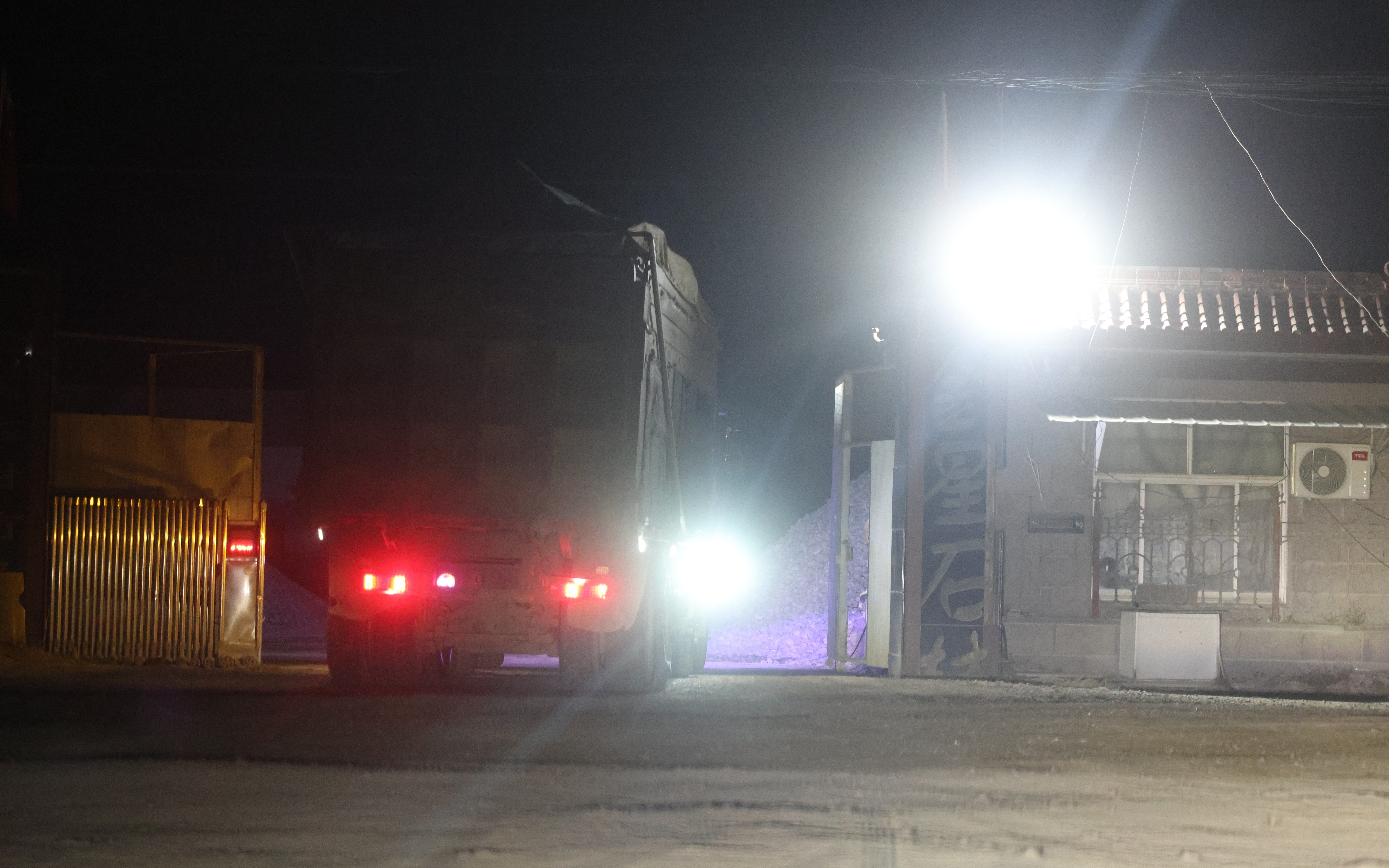 11月27日晚,一辆货车满载圣泉生态公司所开采的矿石,驶进平邑县金星石材公司。新京报记者李英强摄
