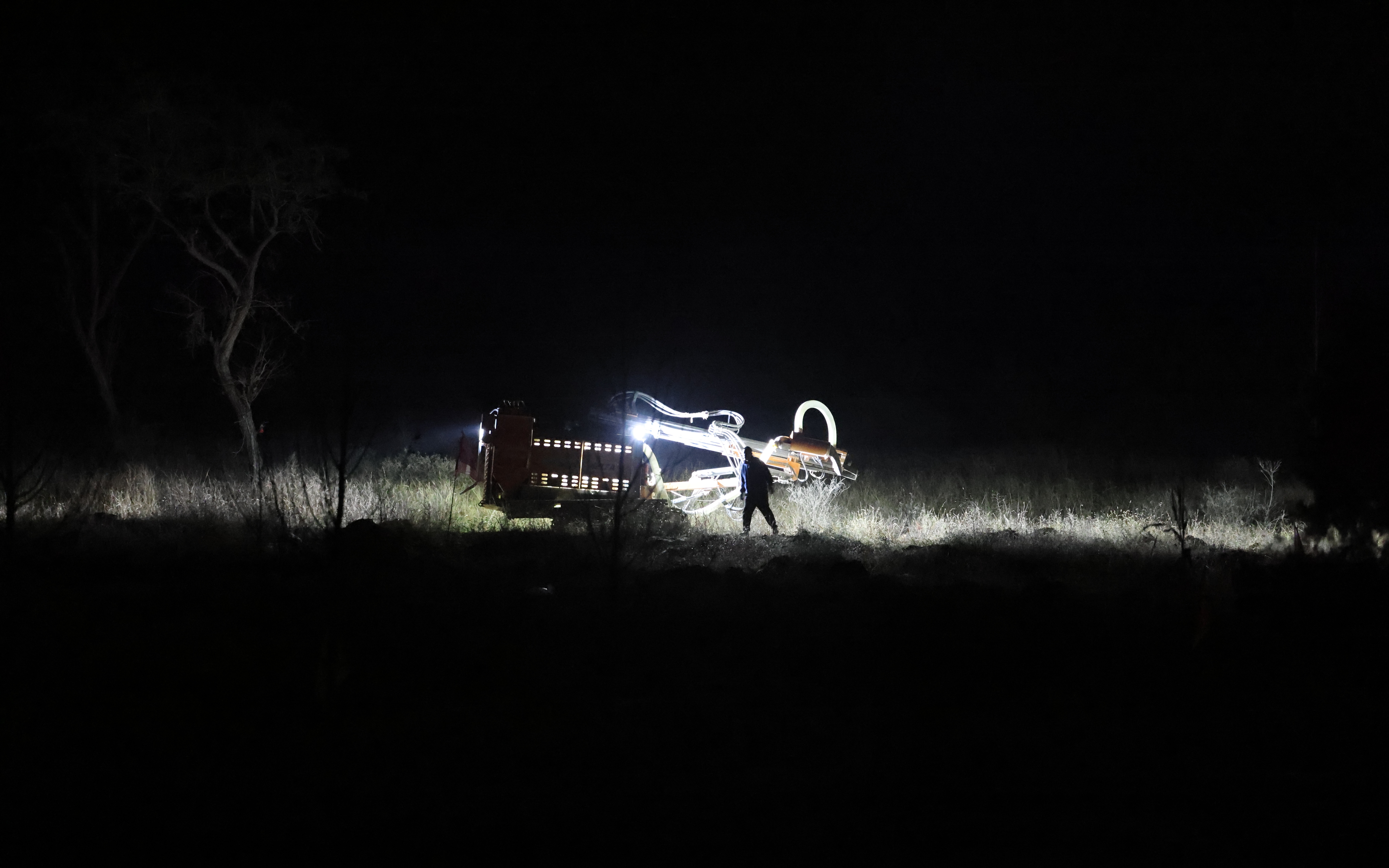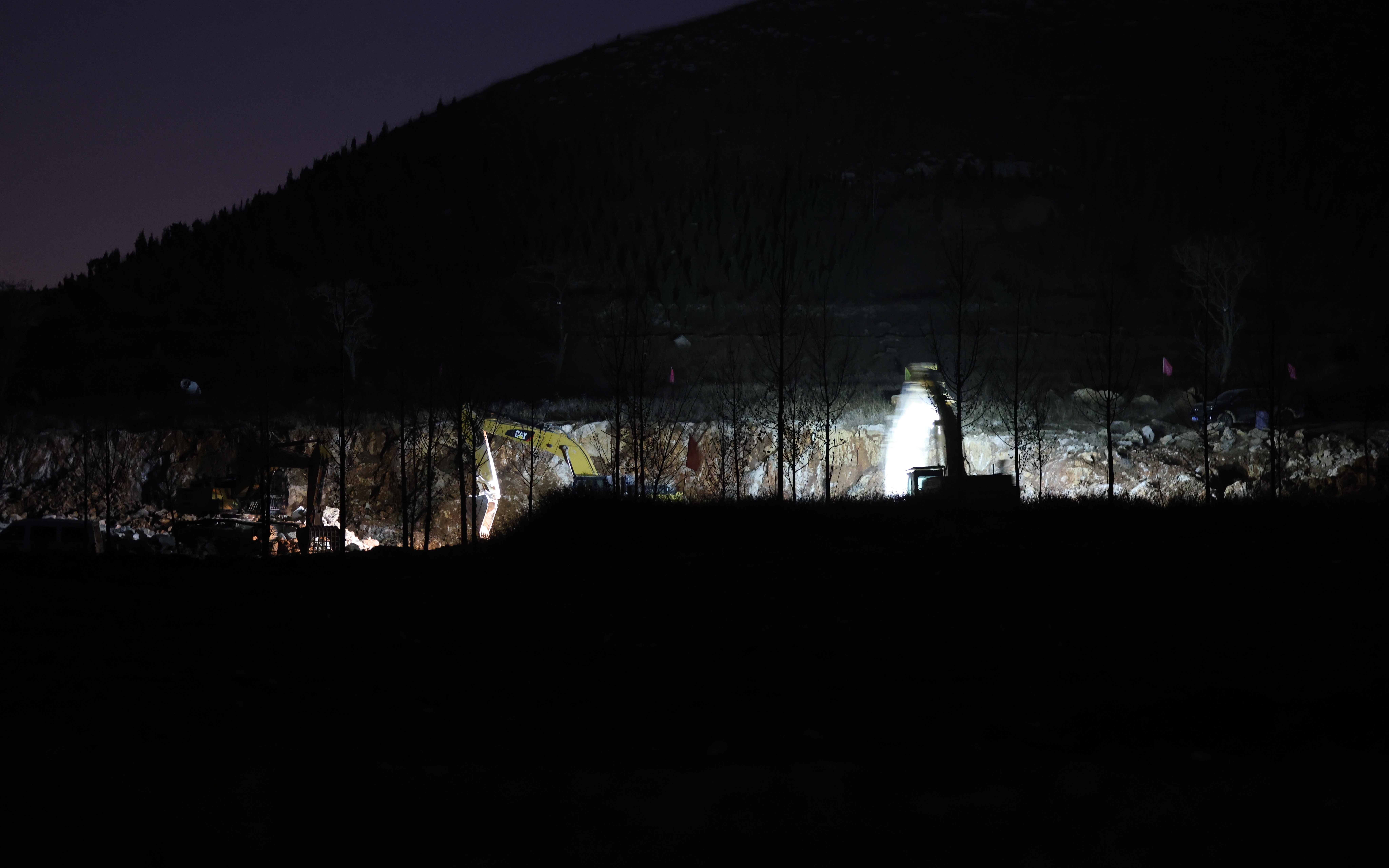 11月28日晚8时,圣泉生态公司养殖场内两台铲车正在开采矿石。新京报记者李英强摄
