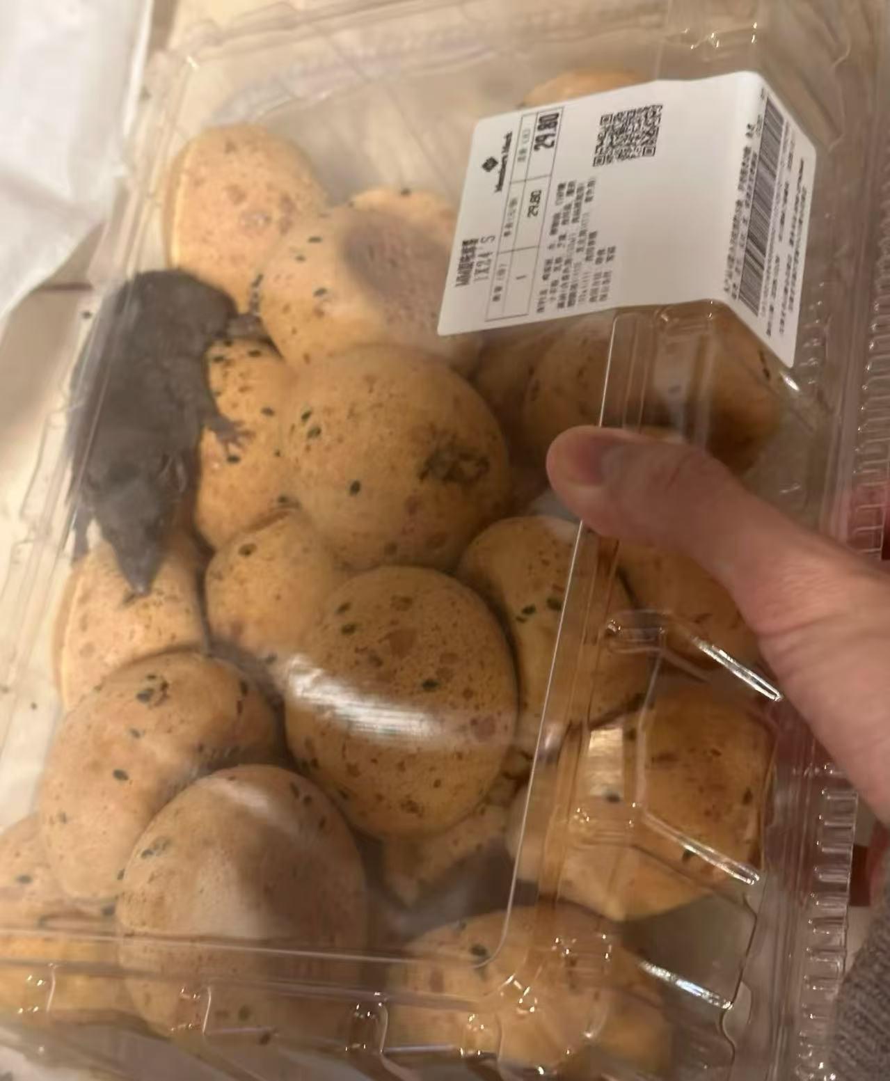 该消费者发布的图片显示,一盒山姆麻薯中有一只老鼠,该盒麻薯售价29.8元,有部分麻薯表面出现凹陷。