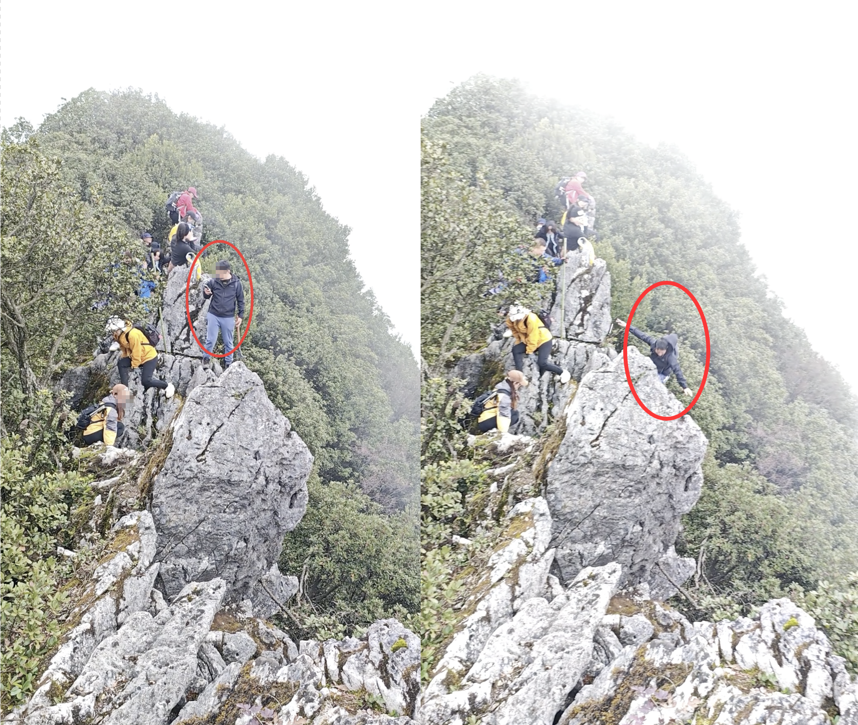 近日,一段“男子登山玩手机坠崖”的视频在网络热传。视频中,一群人在山顶攀行,有些人正在拍照,其中一名右手持手机左手持柴刀的男子在低头看手机的瞬间,左脚所踩岩块突然脱落,整个人瞬间坠崖。随着视频一同热传的,还有一张疑似坠崖男子本人在朋友圈发布报平安的截图。关于事发地点,有人说是深圳排牙山,也有人说是四川华蓥山的“刀片岩”。