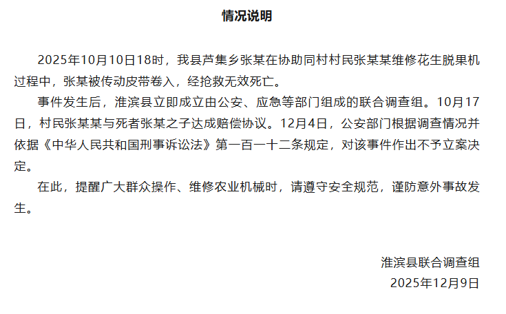 新京报讯12月9日,淮滨县联合调查组发布情况说明:2025年10月10日18时,该县芦集乡张某在协助同村村民张某某维修花生脱果机过程中,张某被传动皮带卷入,经抢救无效死亡。