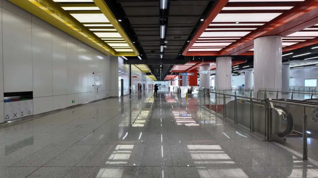 西塱站装修设计通过不同线路对应的线路色,打造色彩差异化扶梯交通点,形成强烈的视觉引导系统,便于在复杂的枢纽空间中有效引导客流,提高换乘效率。